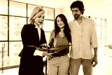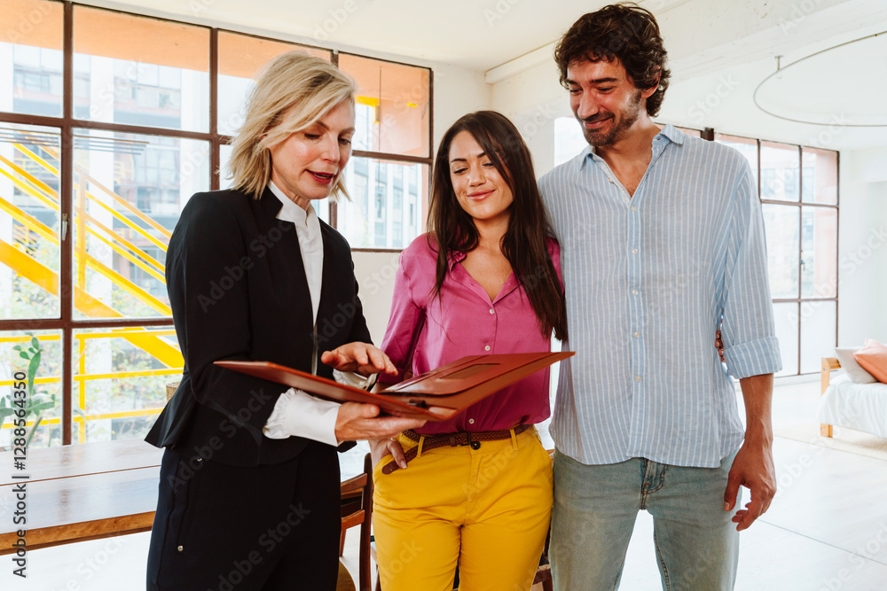 Real estate agent showing a new apartment and features of a good investment to a young couple. Woman and man buying a property in a rich area of the city.