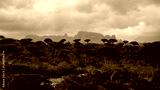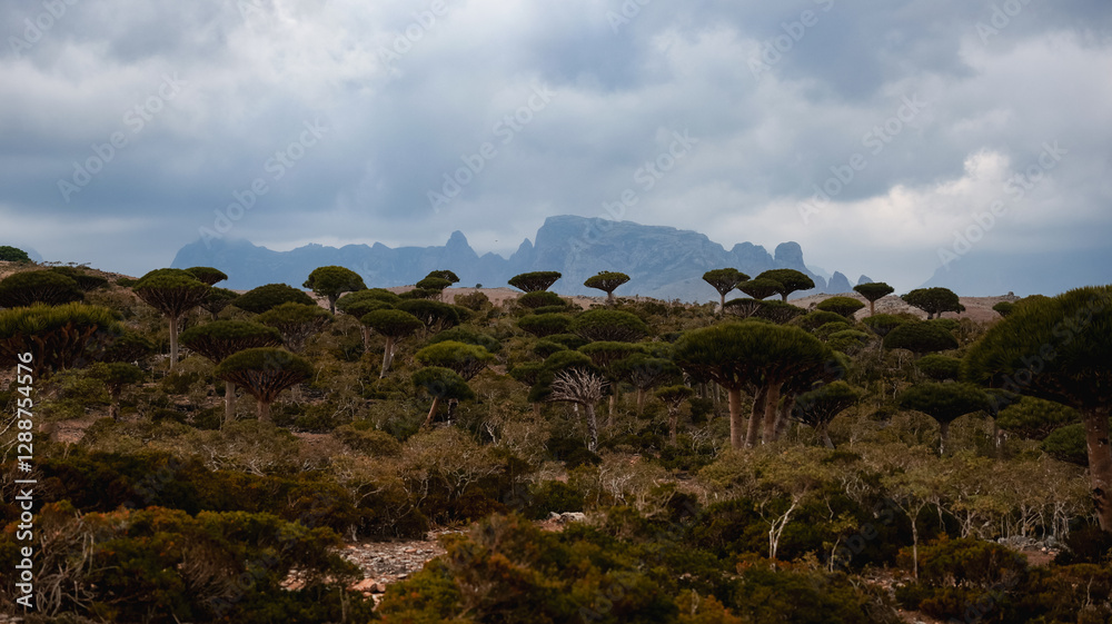 Unique landscape of Socotra with endemic trees and mountain background under cloudy sky