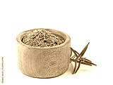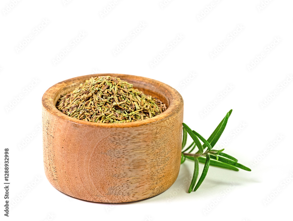 Gerebelter, getrockneter Rosmarin vor weißem Hintergrund