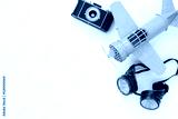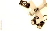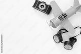 vintage toy plane, old photo camera and pilot glasses