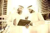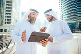 Senior and young arabian men wearing kandura traditional dress from uae in Dubai. Speaking about business plans
