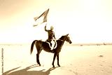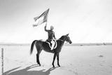 Young adult with Kandura, the emirates traditional clothes, riding his horse in the desert