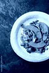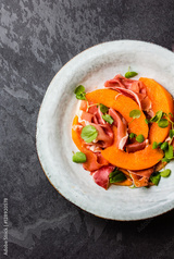 Ham jamon, melon and arugula salad on grey plate