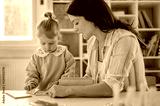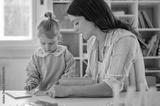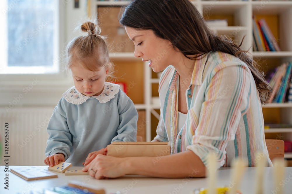 A caring young woman and a toddler engage in a hands-on learning activity with wooden Montessori toys in a bright, organized playroom