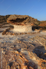 Famous stone mushroom, a rare geological phenomenon which the people of the island of Kimolos call “Skiadi" at sunset, Cyclades, Greece