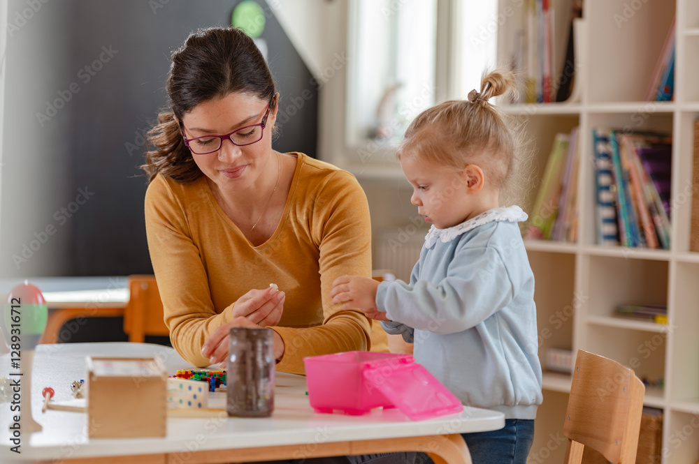 A patient teacher gently guides a shy preschool girl in a classroom activity, helping her adapt to the new environment and build confidence through hands-on learning and engagement