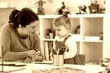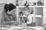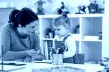 A young girl in a denim dress holds a colored pencil while interacting with her smiling teacher in a bright classroom, engaging in a fun and educational drawing activity