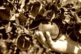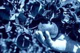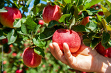 Close-up of a farmer's hand harvesting a ripe red apple from a tree in an orchard on a sunny day