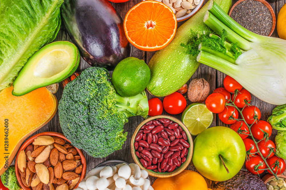 Healthy vegan vegetarian food clean eating. Set of Food supermarket. Fresh vegetables, fruits and seeds
