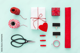 Gift boxes wrapped in red checked paper and the contents of a workspace composed. Different objects on a mint color table. Flat lay.Christmas (xmas) or New year gift packing. Holiday decor concept.