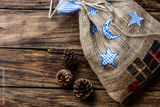 Christmas background with gift bag and fir tree cones