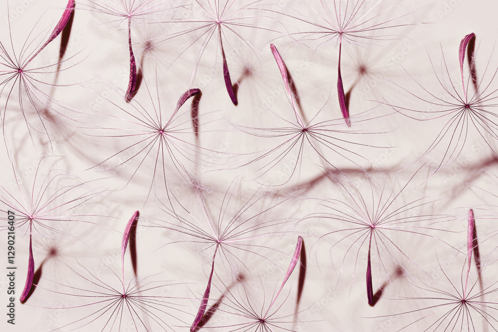 Nature abstract of seeds of blowball flower, natural organic texture as natural background. Macro texture, pastel purple beige color aesthetic photo with seeds umbrella shaped, botanical design