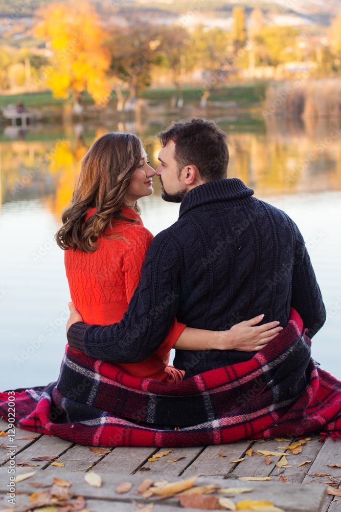 Pregnant wife and husband are resting near lake