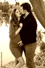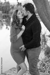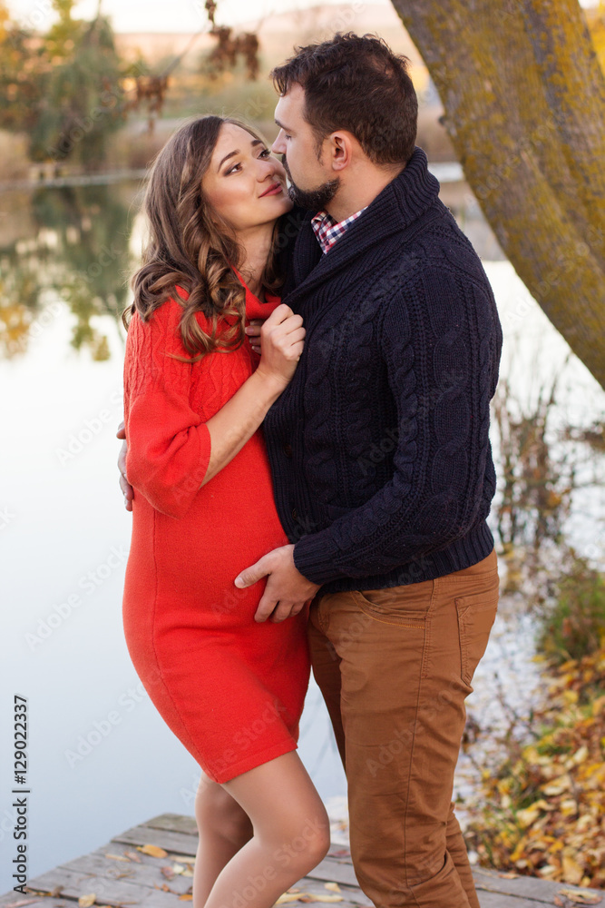 Pregnant woman and man are resting near lake