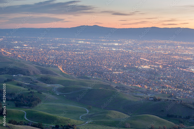 Silicon Valley and Green Hills at Dusk. Monument Peak, Ed R. Levin County Park, Milpitas, California, USA.
