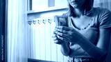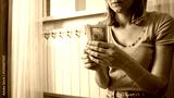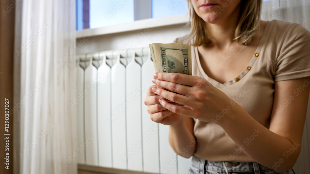 A woman sits calmly near a window, holding a bundle of cash in her hands. The warm light highlights her focused expression as she carefully counts the money.