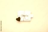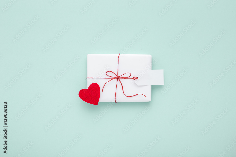 Valentine or birthday white gift with red bow, blank label decorated with felt heart on pastel blue background. Valentines day. Flat lay. Copy space.