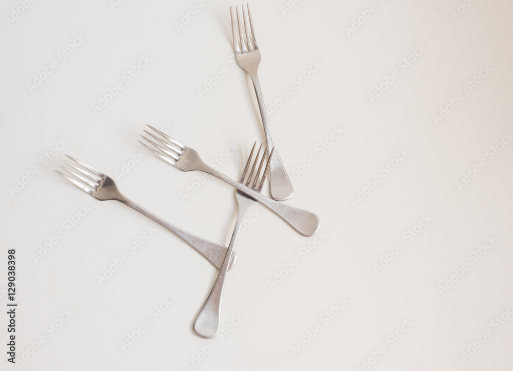 Food background - high angle view of four forks scattered on white table with copy space to right