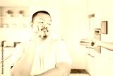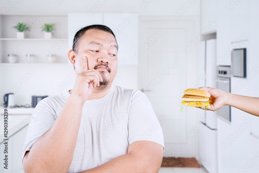 Man Hesitating to Eat Fast Food Burger — Healthy Choices and Self-Control Concept