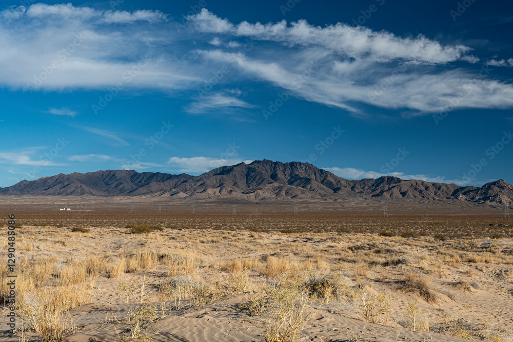 A vast desert landscape showcasing rugged mountains against a brilliant blue sky with scattered clouds, highlighting the beauty of arid environments and natural vistas.