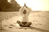 Middle-aged woman does yoga on the shore of the Indian Ocean early in the morning