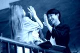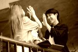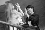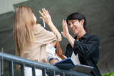 Group of asian businesspeople are keeping arms raised hi five and expressing joyful while standing for her work achievement in front of her coworkers.achieving goals.high five,closing a deal,success
