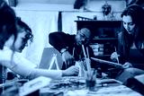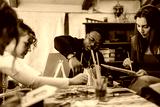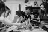 A diverse group of friends participates in a creative painting session, enjoying quality time together while working on their individual art projects indoors in a cozy and inspiring environment.