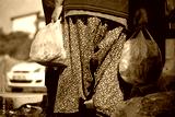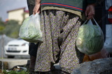 Dorffrau trägt Plastiktüten mit Kohl in der Hand