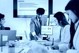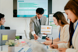 Man is giving a presentation to a group of people in a conference room