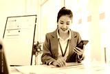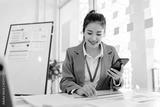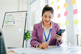 Woman in a purple jacket is smiling while looking at her cell phone