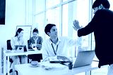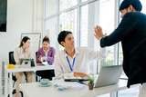 Man and a woman are shaking hands in a business setting