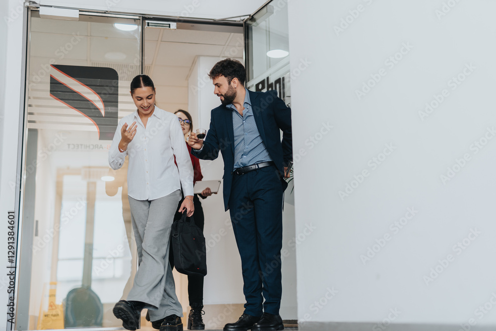 A group of business colleagues leaving an office building share a lively conversation, exemplifying teamwork and collaboration in a modern work environment.