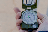 Busola na dłoni podróżnika. Poszukiwanie azymutu do celu. Dłoń trzyma wojskowy kompas z oliwkowozieloną obudową. Kompas ma obrotową tarczę, stopnie zaznaczone na krawędzi i linię celowniczą .