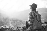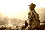 Young woman sitting at viewpoint. Travel girl with backpack sitting outdoor