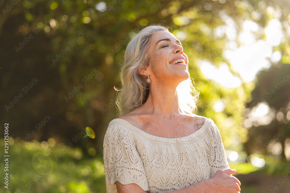 A joyful mature woman basks in the sunlight, relishing the surrounding nature in a vibrant, lush green park. Her expression radiates happiness and a sense of peace.