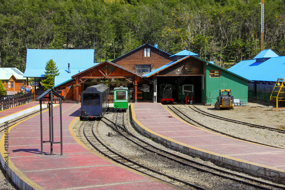 Platform of the station of the Tren del Fin del Mundo ("Train of the End of the World") or Southern Fuegian Railway near Ushuaia in the Tierra del Fuego Province of Argentina