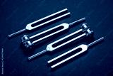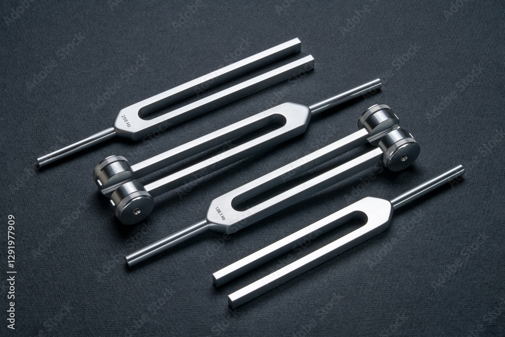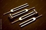 Set of weighted and unweighted metal tuning forks used for tuning musical instruments, sound therapy, chakra healing or relaxation.