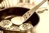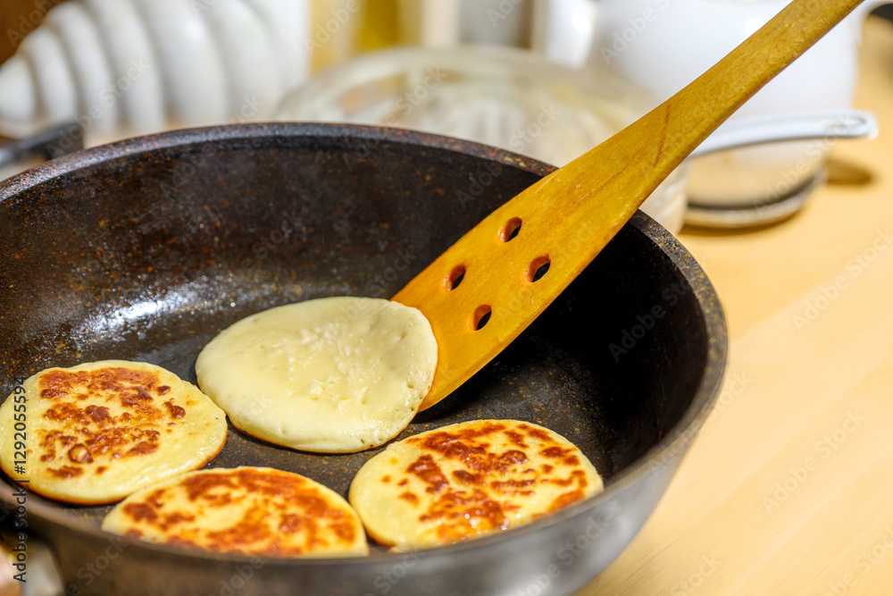 Delicious and Fluffy Pancakes Cooking in a Skillet on the Stovetop with Buttery Goodness