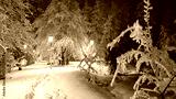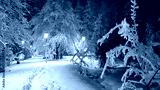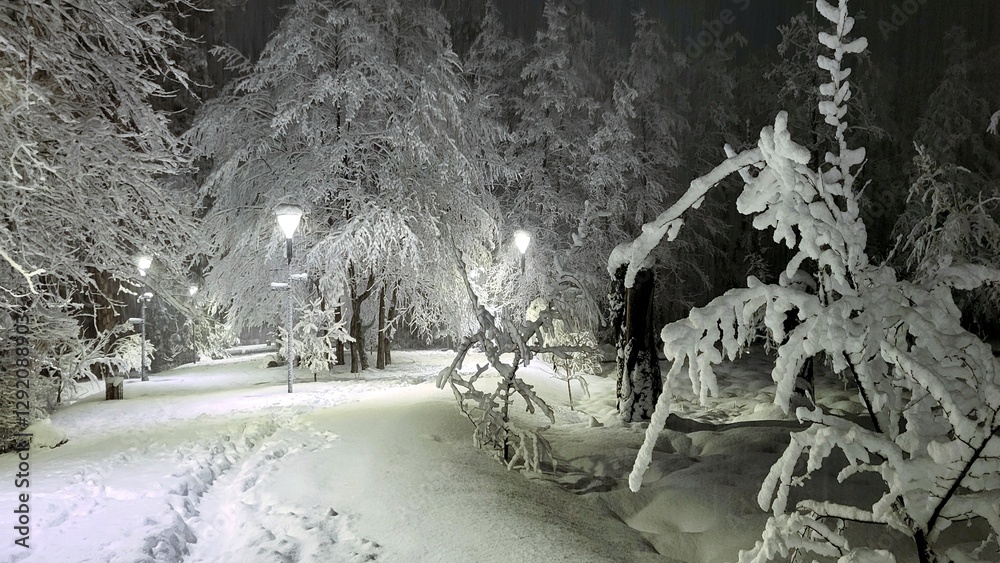 Winter landscape in the evening park, trees in the snow, lanterns are burning