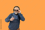 An adult gray-haired man enjoys listening to music with wireless headphones. In his hand he holds a glass with an alcoholic beverage. The background is yellow. Copy space.