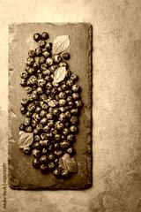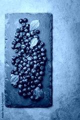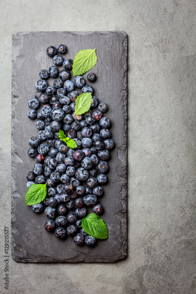 Berry blueberry with fresh mint leaves on black slate, top