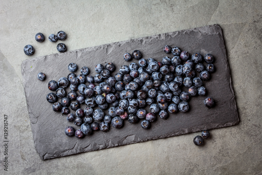 Berry blueberry with fresh mint leaves on black slate, top