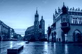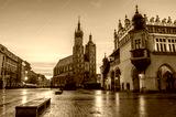 St Mary's church and Cloth Hall on Main Market Square in Krakow, illuminated in the morning