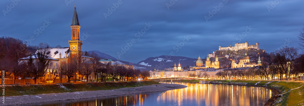 Evening view of Christuskirche and Hohensalzburg Fortress in Salzburg, Austria