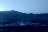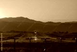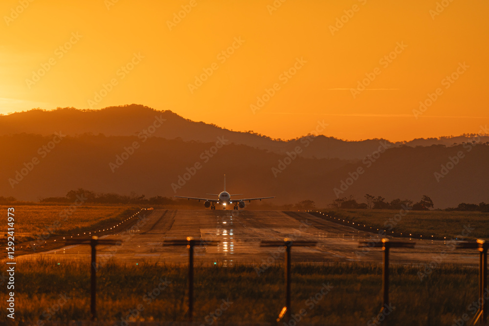 Commercial airplane landing on runway at sunset with mountains in the background