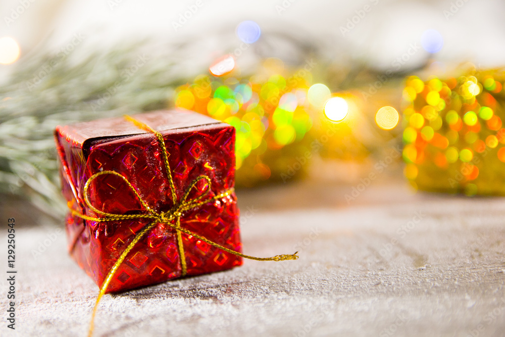 brightly colored gift boxes on wooden background, top view, new year and Christmas. Bright shade