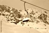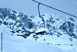 Snowy mountain ski-lift no people, blue sky, azure, air, freshness, ecology. High quality photo