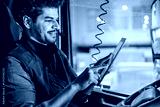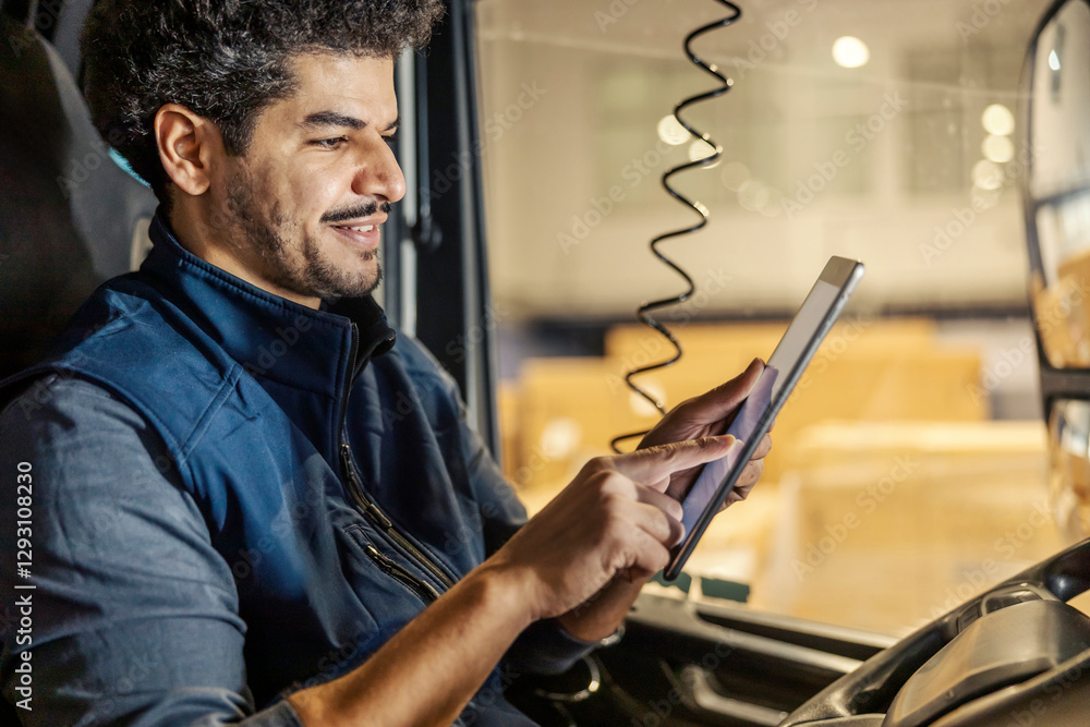Side view of smiling interracial truck driver scrolling on tablet in truck and doing last checking before trip.