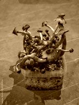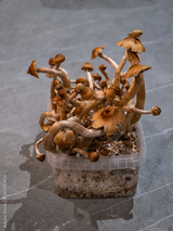CLOSE UP, DOF: Magic mushrooms flourishing in a plastic cultivation tray. Healthy fungi colony with long, twisted stems and fully developed light brown caps, with some shrooms towering over others.