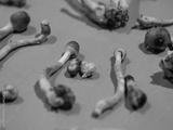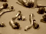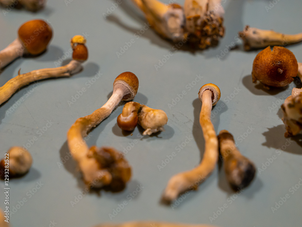 MACRO, CLOSE UP: Detailed view of magic mushrooms scattered across a tray. Display of intricate textures of the twisted stems and brown caps of homegrown Psilocybe cubensis intended for microdosing.